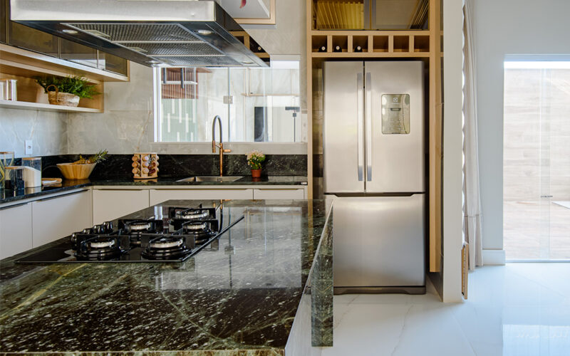 If you have a modern kitchen design, you truly cannot go wrong with a black countertop. This black quartzite countertop blends harmoniously with this contemporary dark-toned kitchen. For further contrast, it has thin white veining.